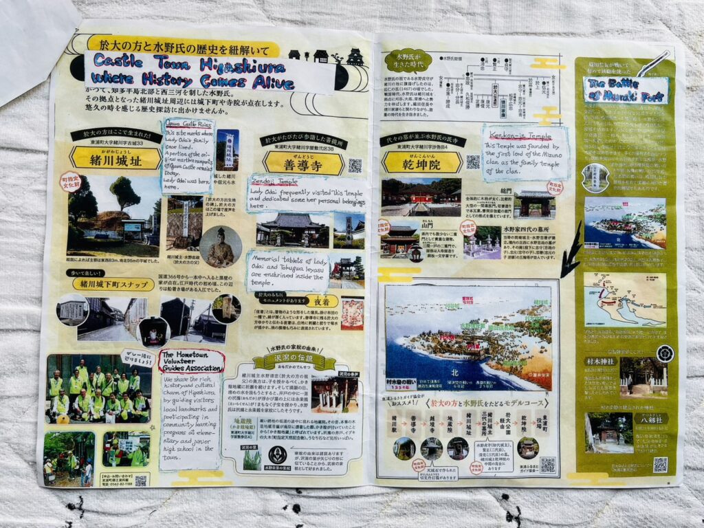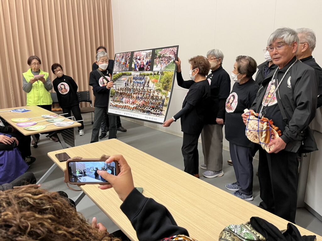 この日のメインは手作り鎧の着付けで、鎧の会の皆さんの大奮闘でお客さんたちもヒートアップ。鎧を着ての記念撮影はとても賑やかな場に。そうした中で10分間でしたが観光協会パンフレットのメインの箇所を英語で説明しました。質問にも立派な受け答えができたと評価されました。よって、この日は東浦デーとして大いに情報発信ができたものと思います。記念撮影には日高町長の顔も見えます。
