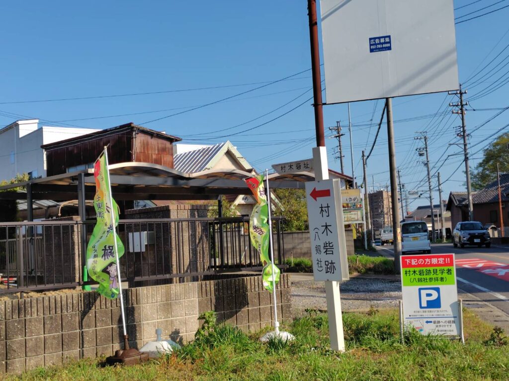 道路わきに建つ村木砦跡の案内板は、細長い板に書かれたものでした。走る車からは確認するのがちょっと難しく、見やすくしたいとかねがね要望してきました。今回、それがかない両方向から見やすくて大きな物になり、その下に置かれているカラーの駐車場の案内とともに存在がくっきりしました。